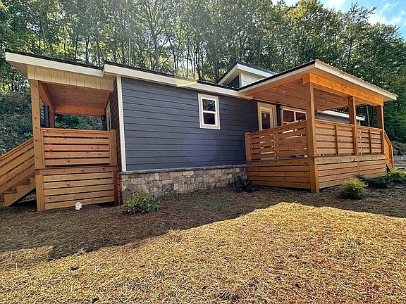 Custom Designed Home on an Un-Restricted lot, featuring a Seasonal Mountain View! Completed new in 2023 with a metal roof and covered porches with composite deck boards. As you enter the home you will see the popular metal accented ceiling along with the tongue and groove walls. This home features a spacious kitchen with granite counter tops and stainless appliances. The bar area will accommodate bar stool seating for added dining space. This floor plan is a split bedroom plan for added privacy with vinyl LVP flooring throughout. One bedroom has a bathroom adjacent in the hall with a tub shower combo and in that hallway you will find the laundry area. The opposing side of the home has a hall bathroom with a shower and the bedroom has its own private door to the exterior of the home. The level yard area offers space for a garden or more outdoor living space. All of this located close to Downtown Hiawassee, Young Harris, Shopping, Restaurants, Golf Courses, Wineries, Marinas and Lake Chatuge.