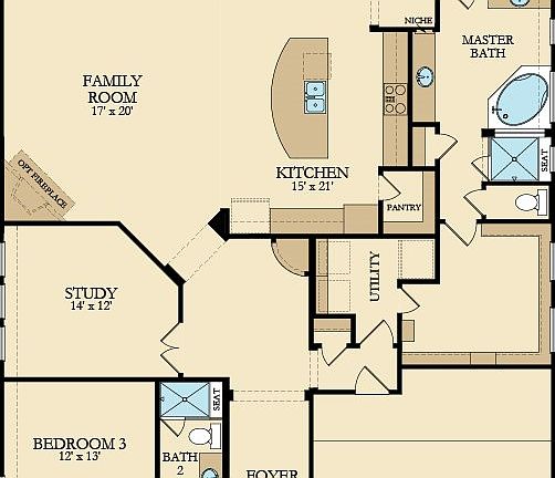 The stunning single story Colburn floor plan by Village Builders features an inviting front porch and entry foyer, a handsome study with french doors, an open island kitchen with a large walk-in pantry, a spacious family room with the option to add a cozy corner fireplace, and an adjoining dining room that offers access to the relaxing covered rear patio. The master bedroom features an en suite master bathroom with dual sinks, separate shower and corner tub, private toilet enclosure, and a generous walk-in master closet that offers access to the handy utility room with freezer space.