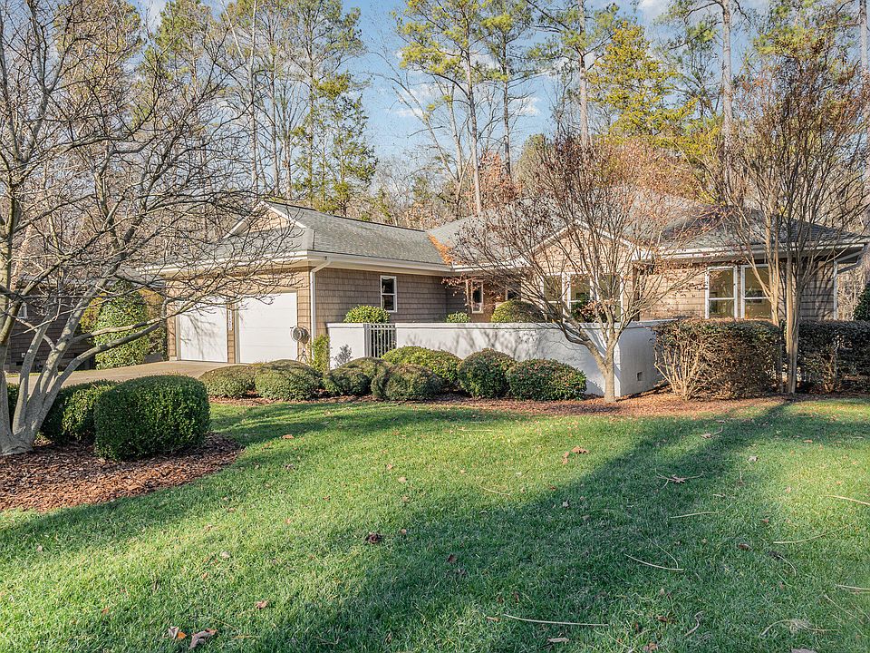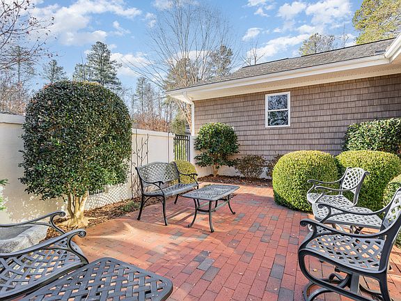 Beautifully-maintained home on choice wooded site in The Knolls. Open, one-level design with high ceilings and large windows that provide beautiful views. Hardwood floors are found in the foyer, living room, dining room, and kitchen. The living room has windows overlooking the mature woods in back of the house and has a gas Heat-n-Glo fireplace. The kitchen features cherry cabinetry with pullouts, granite counter tops, tile backsplash, gas cooktop, built-in oven and microwave, a raised island with sink and eating bar, and newly replaced Bosch dishwasher and refrigerator. The adjoining dining room has a glass door that opens to the screened porch with brick flooring and a ceiling fan. The main bedroom suite has a large walk-in closet with built-ins and a private bath with a large walk-in tile shower, tile floor, a double sink vanity with granite counter tops, and convenient linen storage cabinetry. There's a second bedroom with a good-sized closet and a second bath with tile floor and tub surround. The den/study has east-facing windows that provide nice morning sun and a view of the bricked courtyard garden with mature boxwoods and camelias. Laundry room with utility sink and cabinet storage. Two-car garage with space for a workshop and extra freezer. Concrete slab for storage and new dehumidifier in crawlspace. Gutters with no-maintenance gutter guards, full-house surge protector, UV anti-mold light on HVAC, and additional smoke alarms. Fearrington amenities: The Fearrington Homeowners' Association provides tennis, bocce, playground, walking trails, buildings with postal boxes and other services. Fearrington Cares provides health related classes, health related equipment to loan, a nurse twice a week and other services. The Gathering Place has offices for village and HOA information, meeting rooms, events and a concert series. Fearrington Village has a world-famous inn, restaurant, shops, salon, bookstore and events.