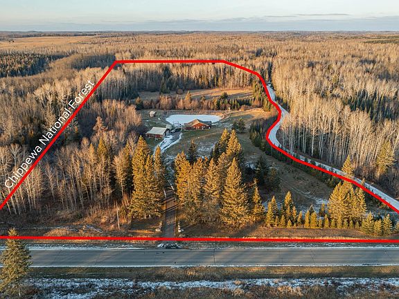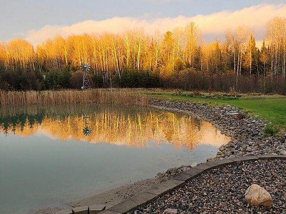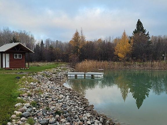 Immaculate home with 15 acres. One level living with 2 bedrooms, 2 bathrooms, including a private primary suite, open concept living, tile floors, electric fireplace, and a four season porch. Outside, you'll love the paved driveway, oversized garage with lean-to, beautiful landscaping all around, and large swimming pond with a sauna at its edge. The acreage gives nice privacy from the road, could make a great setup for horses or farmstead, and adjoins public land. This is a perfect way to start living the "Up North" dream!