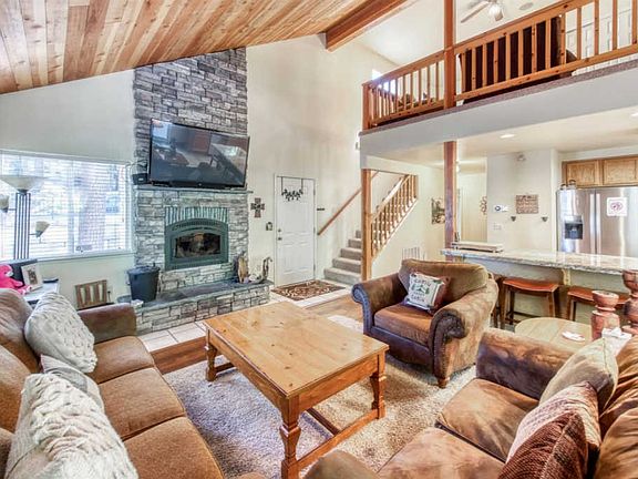 Listing Presented by Kimberly L. Hogue & Associates----Welcome to Ockenden Ranch. Great location and easy access. Open floor plan with a large kitchen, granite countertop island, stainless appliances and a breakfast bar. The kitchen is open to the living room which features tongue and groove ceilings, a gas fireplace, hardwood flooring with a tile entryway and a sliding door that steps out on to a large deck, which steps down to a concrete patio with a beautiful rock firepit. The main level also features the master bedroom suite. Upstairs you will find the coziest loft ever, along with a second bedroom and full bath. Downstairs is the 3rd bedroom and guest bath with private access to the concrete patio and firepit. This home is one of the few homes in Shaver Lake with air conditioning and is a great vacation rental. Not to mention new SOLAR which is paid for!