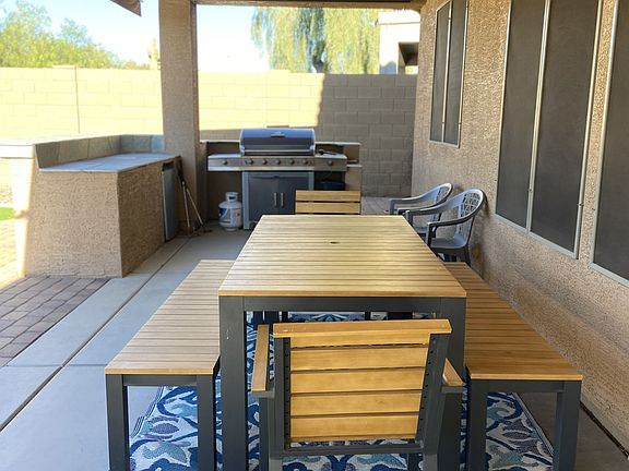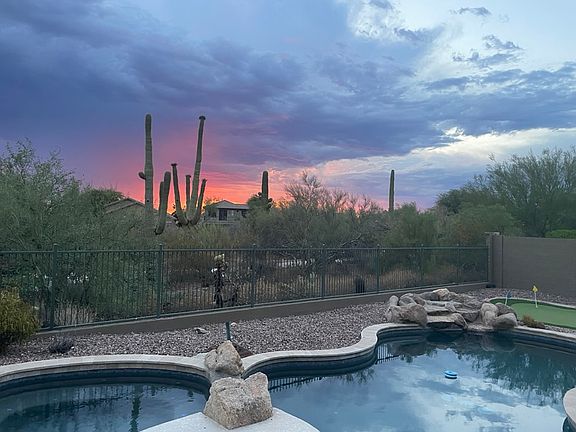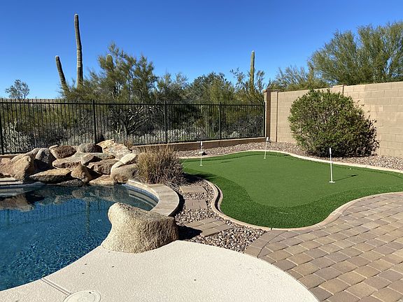 You'll love the great private backyard, features covered patio with electric extended awning, a built in BBQ bar area with gas grill and bar, another raised side patio area with a fireplace, a heated pebble tech spa and pool with a boulder water fall. Backyard features extended paver patio and synthetic turf golf putting area. This great lot has no back neighbors with view fencing with saguaros and sunsets overlooking the walking path and wash out back and the pocket park right next door and neighbor only on 1 side. You can sit in the pool or the loungers while you enjoy the spectacular sunsets. * Sorry no pets. ** backyard pool is not fenced but has the safety feature of a heavy slider door with alarm.