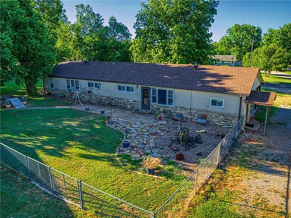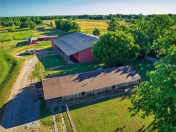 HORSES WILL LOVE THIS PLACE!! Indoor arena with steel frame & metal construction, covered walk-way to stalls in barns. Barn can be 10 stalls, fans, lights, wood & steel gates, tack room for 20 saddles, pipe rail fencing, horse walker & pens. 32 x 80 hay barn w/electric & water, 30 x 80 red barn, 5 stall pasture barn & 16 x 45 shop building.This has been a roping & training facility for years, beautiful place. 2 dbl wides on back of property that are currently rented with $1500 month income with gravel road to them. A beautiful hay meadow surrounded by trees in the back property with pond. The ranch style home will please the family with 3 beds plus office, 2 living areas, lots of great windows and covered front porch. All the appliances in kitchen stay, city water with ONG & OG&E, newer septic tank & lateral lines. The backyard for the evenings is just lovely and the big shade trees make for a breeze in the Okla skies. The creek line on w side of prop is in flood zone, house is not.
