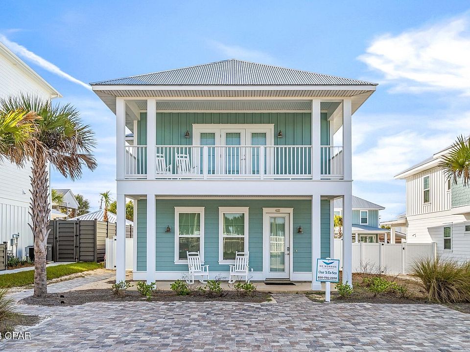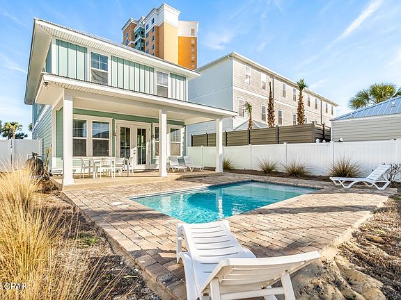 Welcome to the perfect beach retreat for a vacation rental or second home featuring close proximity to beach access, fenced in private pool area, and two owner's suites. The second level owner's suite has access to the large balcony with views of the Gulf. Large bathroom with tile shower, double vanity, and walk-in closet. Through upstairs hall you will find the shared bath, bunk room, and two additional bedrooms. Downstairs level includes second owner's suite on first floor. French doors from the living room area will lead you to the covered patio and pool plus outdoor shower. The kitchen overlooks living space and features granite countertops, large island, stainless steel appliances, and white cabinets.