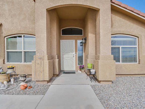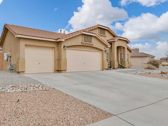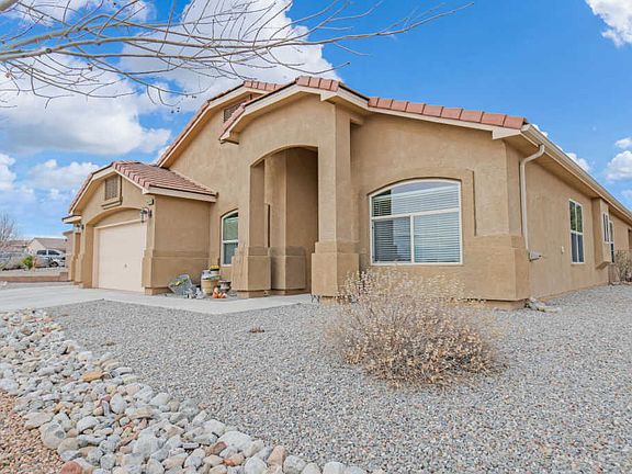 Gorgeous 4-bed, 2-bath home with a 3-car garage AND solar panels! It starts with great curb appeal and features a perfect view of the Balloon Fiesta Park. Inside includes wood laminate flooring and vaulted ceilings giving the home a modern, open look & feel. The cozy fireplace adds a warming touch to the large great room. The open kitchen features an island and breakfast nook for your morning cup of coffee. Homey master suite with a walk-in closet is perfect for relaxing while the large bathroom has double sinks, a garden tub and a separate shower. The front and backyard are xeriscaped with a covered patio in the rear with plenty of room for seating. An oversized RV gate is installed for the traveling enthusiast, with raised walls on both sides of the yard for privacy. See it today!