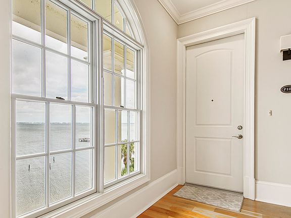 French doors lead to the bayside balcony from the living room. The primary suite also has access to the balcony and beautiful views of the water. The ensuite bath offers double vanities, large soaking-tub, and separate shower. The second and third bedrooms each have board & baton wood trim and doors leading to the community-side balcony.