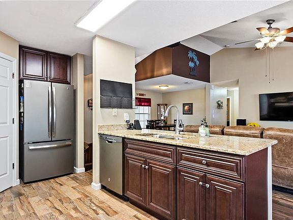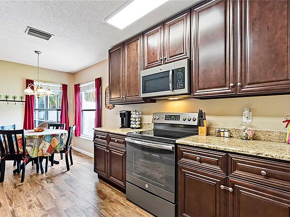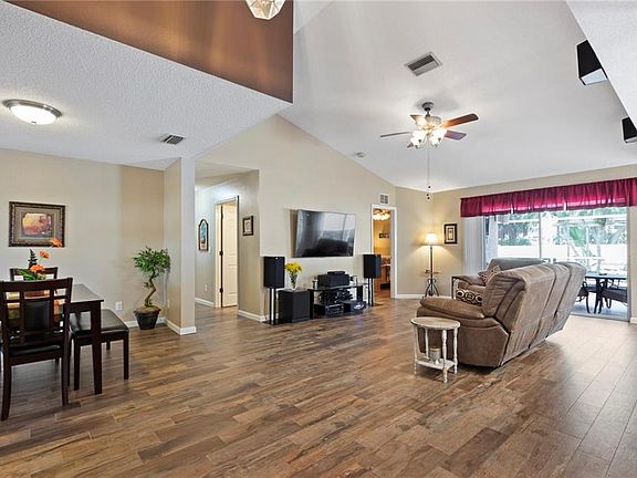 *Priced to Sell* This 3-bedroom, 2-bath POOL HOME with tastefully updated interior shows true pride of ownership, well-cared for and has LOTS of upgrades including stunning wood-look ceramic tile flooring throughout; gorgeous real-wood cabinets, GRANITE countertops & STAINLESS STEEL APPLIANCES in the kitchen; stylish vanities in the hall and master baths. This home has everything you want! Open floor plan; living room with cathedral ceiling; dining room; open kitchen with separate eating space; bonus room that could be used as an OFFICE or FOURTH BEDROOM; inside utility room and two car garage! The covered LANAI and SCREENED POOL area are perfect for entertaining along with the large vinyl fenced backyard featuring a custom-built fire pit & seating area with three hanging porch-style swings and benches surrounding. Schedule your showing today before this one is gone!