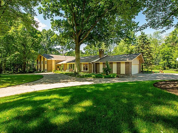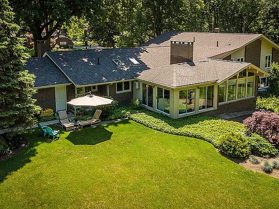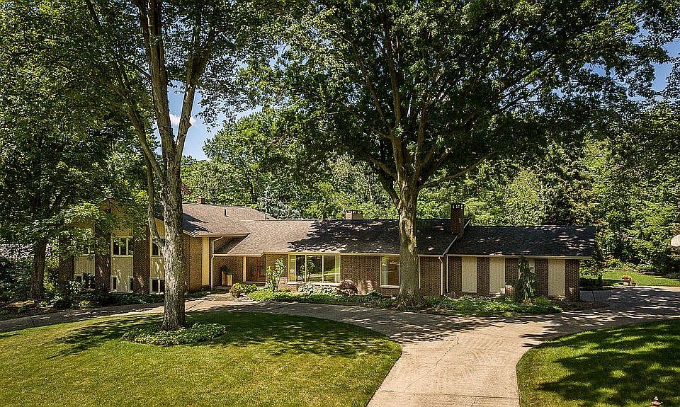 Sprawling Market Hills, Frank Lloyd Wright inspired, Mid-Century Modern Home blurs the lines between indoors and outdoors. Situated on 1.2 acres of a park-like setting, this immaculate, 5400 square foot home inspires tranquility and peace. Every season unfolds to be savored from the generous, new windows and luscious setting. There is substantial room for large family living, elegant entertaining, live-in relatives or multiple people working/schooling from home. This home includes four bedrooms, two of which are en-suite. The main level features an elegant (40X18) living/dining room combination, as well as a vaulted great room with beamed ceiling and gas fireplaces. A bright and airy 4 season sunroom off the kitchen and great room on the main level. A second family room (or man-cave) is on the lower level opening to a patio facing a beautiful wooded area. Other special amenities of the home include two offices (or a 5th bdrm), in-door grill, wet bar, sauna, spacious laundry room, unfinished basement, exercise area. You will fall in love with the large open rooms flowing floor plan and privacy that this unique setting affords, while being close to interstate and shopping. The unique architectural style of the home has been retained and enhanced through the present homeowners' attention to maintenance and modernization including: new A/C, furnace, windows, exterior doors, siding, soffit, fascia, garage door, master bath and sunroom remodel, bamboo flooring.
