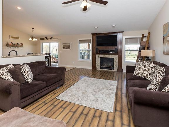 Over 2400 SF of finish in this beautiful walk-out ranch home in Walnut Creek Estates. Main living space is vaulted with tons of natural light. Living room offers a lot of space and gas fireplace. Dining area has sliders to the covered deck with fan, sun shade, and built-in speakers. Large kitchen offers tile floors, granite counter tops, and SS appliances. Mud room and main floor laundry off the kitchen. Master bedroom faces the private backyard. Lighted tray ceiling and master bath with double sinks and generous walk-in closet. Two additional main floor bedrooms share a full bath. All bathrooms have granite counter tops. The walk-out basement is fully finished with an additional HUGE bedroom and full bathroom. Tons of storage. You will never have backyard neighbors with walking/bike trail and Walnut Creek behind the house. Additional patio space under the covered deck. 3 stall garage with extra tall 3rd stall. Don't miss your opportunity to live here!