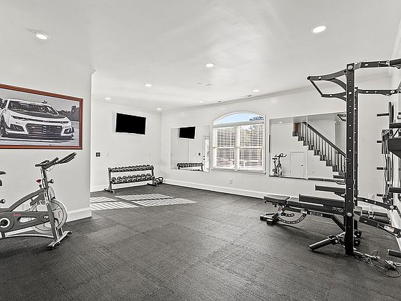 Inside, a custom gym with commercial-grade flooring complements a bright, open floor plan with smooth ceilings, fresh paint, and renovated baths. Modern lighting and a whole-home Philips Hue smart system create effortless ambiance.