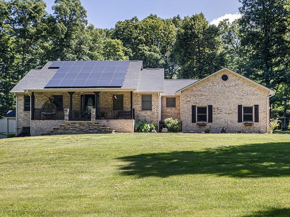 If you need room to stretch your legs inside and outside in a park-like setting on 6+/- acres of natural beauty and a fabulous brick home featuring 3BRs, 3.5BA plus a full, finished, walkout basement with full bath and lots of extra room to spread out, this property may be perfect for you! With solar panels supplying much of the home's electricity, this energy efficient home w/ADT smart features has a split floor plan w/beautiful hardwood floors and great room w/stone accented gas FP and french doors to sunroom overlooking backyard w/large upper and lower tiered decks and above ground pool. Kitchen has granite and solid surface concrete countertops w/cream colored cabinets, stainless steel appliances and breakfast nook w/bay window and separate dining room. The spacious owner's suite has french doors to backyard decks and bathroom with double vanities, spa tub, separate shower and large walk-in closet. This fulltime retreat also offers a brand new HVAC system, new 50-year shingled roof w/gutter guards, attached 2-car garage, detached 3-car garage w/workshop & storage area plus brick detached 1 car garage/shed all nicely appointed on this gorgeous property with a paved/concrete driveway. Claim this private oasis as yours today!