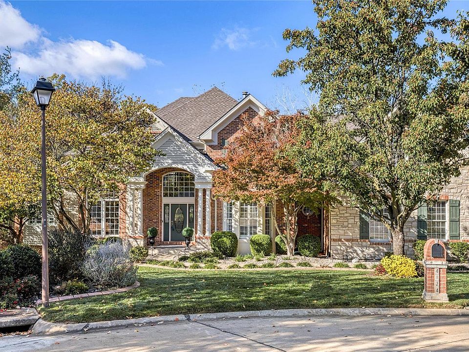 Outstanding brick & stone 1.5 Sty in premier neighborhood! Beautifully designed & stylishly appointed to accommodate daily comfort & gracious entertaining. 2-Sty marble foyer highlighted by dramatic curved staircase leads to study with built-in bookcases, elegant dining room and stunning great room with brick fireplace & soaring windows with private wooded views. Designer kitchen featuring 42” white cabinetry, quartz countertops & KitchenAid appliances adjoins sunlit breakfast room & vaulted hearth room with custom built-ins. Coffered master bedroom suite with 2 walk-in closets & luxury bath with jetted tub opens to private deck with hot tub. Front & rear staircases access 3 additional bedrooms, bonus room & 2 full baths. Walk-out Lower Level includes recreation room with fireplace & entertainment center, billiard room, gathering bar, workout room & full bath. Situated on a .5 acre cul-de-sac lot with 3 decks, patio with fire pit & 3-car garage. Katy Trail is just steps away.
