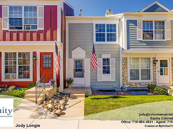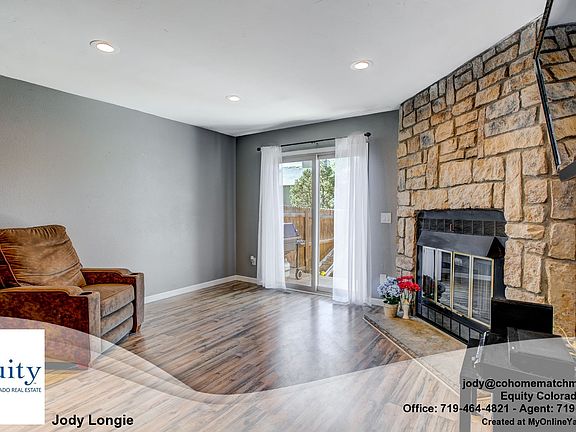 Cute townhome, centrally located and convenient to shopping, restaurants, interstate and so much more. Living room has a stone wood-burning fireplace and a walk-out slider to the private backyard with deck, and BBQ space, storage shed & access to large green space with mature trees. HOA comes with pool and playground for owners and guests, water, sewer, trash pick-up, snow removal, landscape maintenance and all exterior maintenance of home. The finished basement features a 13x11 Bedroom with closet, small window & bathroom with shower, linen closet; Large laundry room with utility sink/workshop space/storage. Master bedroom has 2 walk-in closets. This updated home is comfortable and located close to downtown Colorado Springs, Peterson AFB and Fort Carson. Comes with an assigned parking space directly in front of the home. This home shows beautifully. Come see it today!