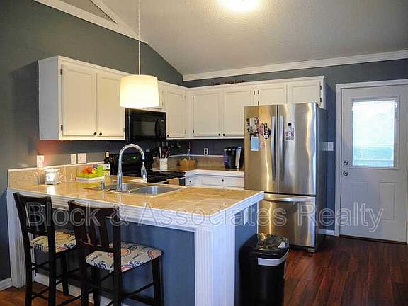 INVESTOR ALERT! This one has steady tenant lease agreement at $1,250 per month until 4/30/2019. Craftsman cutie with wood style flooring, all three bedrooms are spacious with WALK IN CLOSETS, VAULTED LR with FIREPLACE. Open floor plan with ALL ONE LEVEL LIVING. Vaulted master with reclaimed wood wall, dual vanity. Kitchen with tile counters and black appliances. Updated lighting and faucets. Separate laundry room. Large backyard with PRIVACY FENCE, OVERSIZED DECK. Circular drive with plenty of parking.
