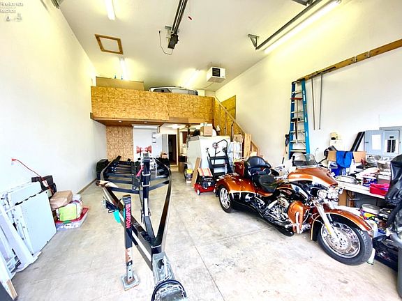 Business Storage Condo with entrance on both ends. Front of entrance with 3 parking spaces has reception area 9 x 18 with company sign above entrance that faces Rt 2 allowing traffic highway frontage advertising to over (ODOT AADT) annual daily traffic of over 20,000. Office area 17.8 x 11.8, full bath with stand up shower. Central AC and forced air heat. Storage unit in the back measures 22 x 35 ( but if needed deeper wall to office can come down to make 55 deep). Back storage area also has utility area for laundry hookup, fridge and cabinets. Loft area above storage has two rooms 15x26.9 and 6x20. Great for extra storage and shelving can stay. Remote combo garage door 13'10H x 15'11W. Intercom from Back entrance and Front. Security system is installed. Overall Unit is 22W x 55L.$1500 year for association fees.