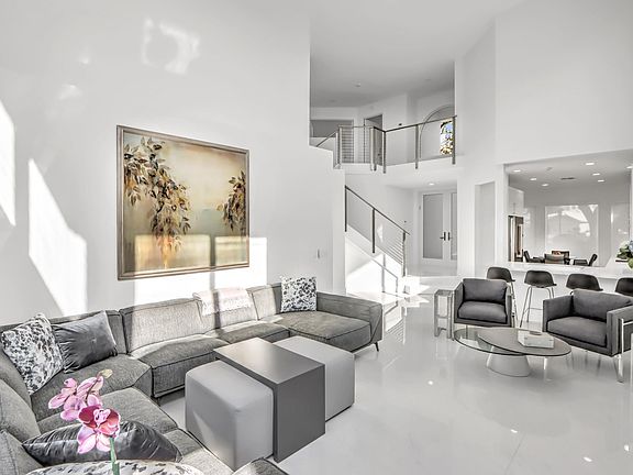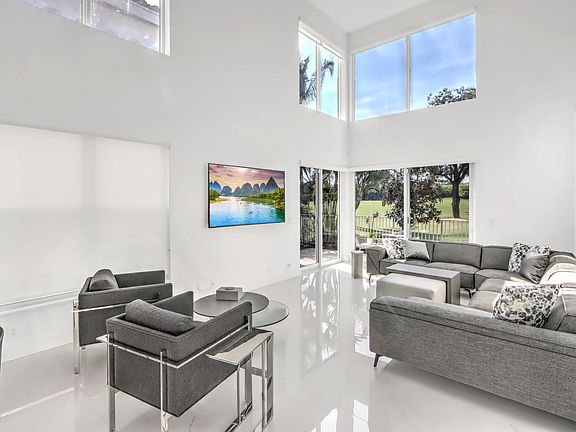 Enjoy the ease of moving into a home with tranquil golf course views remodeled in top of the line finishes. A long driveway leads to this lovely 2-story home of 4 Bedrooms & 3 1/2 Baths - light, bright & renovated with contemporary flair. Features include volume ceilings with LED lighting; white flat-finish walls;48X48 porcelain tile floors; custom solid core doors of modern design; custom window shades;custom closets & a dramatic modern metal cable/rod railing up the stairs. The inviting island kitchen offers white 42'' high-gloss cabinets,quartz countertops & backsplash, stainless steel Bosch appliances & a charming breakfast nook. Completely renovated bathrooms;3rd full bath added in 2024. 2024: New roof, impact windows & doors, garage doors; 2025: New gutters. Furnished or Unfurnished.