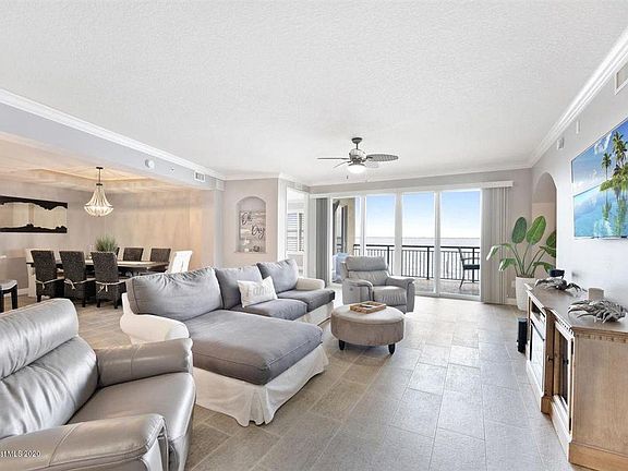 Direct River Residence with Private Boat Slip w 10 K Lift & 2 Car Garage. Gated luxury riverfront condo w/ Pool, Hot Tub, Sauna, Gym, & Boardwalk. Spacious residence w/ soaring views that open onto private terrace. Designed & furnished residence widens by river w/ Master, Great Room, Guest Bedroom, & Terrace w/ direct river frontage. Beautiful designed- custom cabinetry, imported granite, crown molding, impact doors & windows. Master w/ tranquil spa inspired bath. Chef's kitchen with granite tops, pantry, custom cabinetry, recessed lighting, back splash, & stainless appliance. 8' Doors. Phantom screens. Wet Bar. Private terrace offers sweeping views of Banana River & front row seat to holiday Boat Parades. Direct western exposure. Private 2 car garage. Come live the beach island lifestyle!