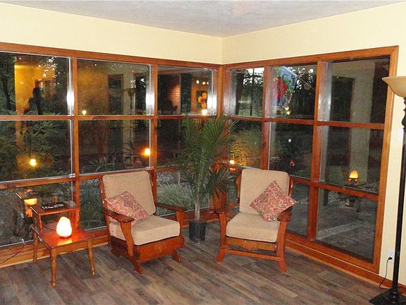 Character, Privacy & One Level living w/lots of areas to entertain!This home is a one of kind! Relax on the tree covered large brick patio or welcoming spacious covered front porch among the night lit gardens.The entry starts you on an adventure in this "Frank Lloyd Wright" stye home emersed in nature!The living room has a fireplace to cozy up to while watching the changing autumn leaves, snowflakes or spring & summer emerge through the two walls of windows.The kitchen & dining rooms have huge sliding doors to an outside patio to welcome the new day or friends & family.The kitchen coffee bar gets your mornings started or add a Magarita maker to get the party going.The dining room has a built in wine rack & brick accent wall.Sliding doors welcome the breeze to your master suite from the covered front porch.The master bath adds to the tranquility w/the soothing soaking tub.The family room has lots of storage&could fit many needs! "Nature is not a place to visit it is home! Welcome Home!