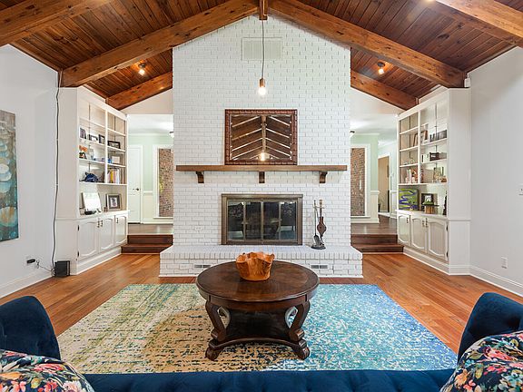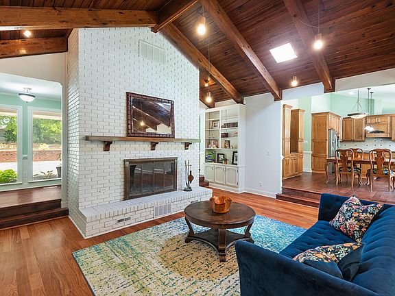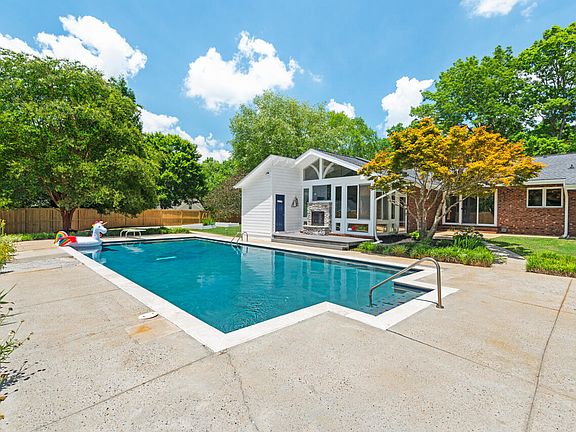 Beneath the porte-cochère, elegant carved double doors open to a one-level mid-century marvel. The magnificent living room features a plank and beam vaulted ceiling and wood burning fireplace with white brick surround. Enjoy the privacy of your owner's suite with sitting room and separate walk-in closets or invite guests who'll each have an en suite bathroom for a remarkable stay. Entertain poolside in all seasons with the see-through fireplace you can enjoy outside on the deck or inside the veranda. Two patio areas and a bath house for convenient changing. You're likely to need that double oven and circular drive with parking for at least ten cars! Did I mention the storage? Large storage closet right across the portico and additional detached building with 2 garage bays, workshop and finished flex space. If you ever want to leave, you're just two-tenths of a mile from the YMCA and the adjacent shopping center. Embrace the lifestyle you deserve!