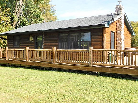 Welcome to your Country Home! Beautiful log home on a private setting, this walkout Rambler is located on 20 acres surrounded by woods and tons of wildlife. Home has a wraparound front porch and back deck overlooking the pond. Enjoy the large mature trees, spacious yard and trail back to a deer stand. Home features an open floor plan with 2 bedrooms and 2 updated bathrooms. Lower level features an office and a large walk-in safe room. Large 60x28 pole building and insulated dog kennel. Enjoy this private oasis!