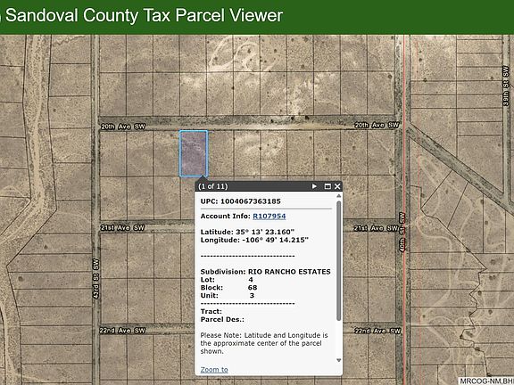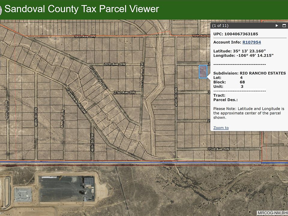 One acre lot in Rio Rancho, near the Bernalillo County line. Large solar farm in nearby to the south. This lot is in Rio Rancho City limits.