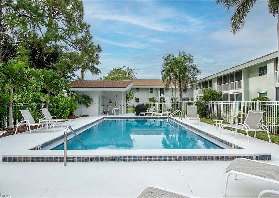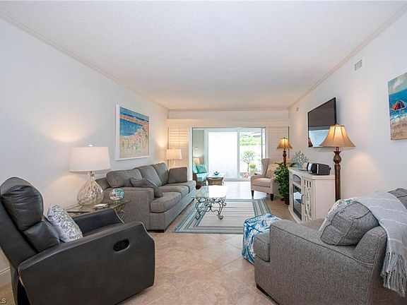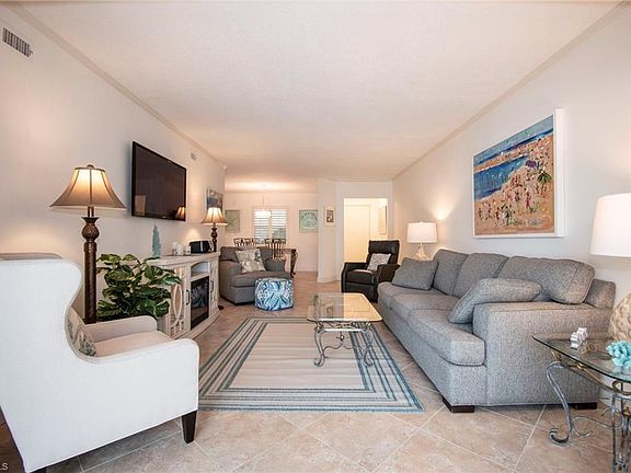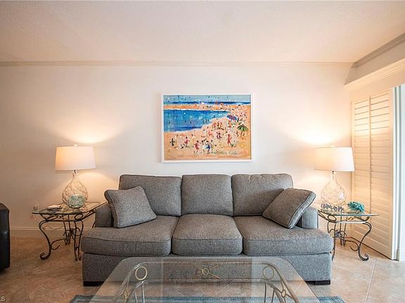 Enjoy this updated, immaculate, meticulous and spacious Park Shore condo. Rarely used and Tastefully decorated with new furnishings, fun tropical bedding and fully stocked kitchen for all your needs. Upon parking close to your private front door, this 1st floor condo is welcoming you into an Open Floor Plan lending it's large living room onto the glassed in lanai. This lanai stretches length of the condo and the views are private courtyard with beautiful lush plantings. Main bedroom offer King size bed and ensuite bathroom. Guest bedroom is conveniently located to the guest bathroom. The kitchen is updated with stainless steel appliances and huge laundry room is adjacent to kitchen. This over 55+ community is welcoming, offers large community pool and gatherings. Park Shore private Beach Pass is available within walking distance as is Venetian Village shops and restaurants. Y