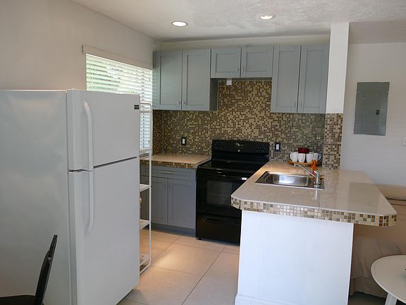 Renovated kitchenPrivate enclosed patioLeafy green streetScreened by palm treesNew installed windowsTile flooringRecessed lighting
