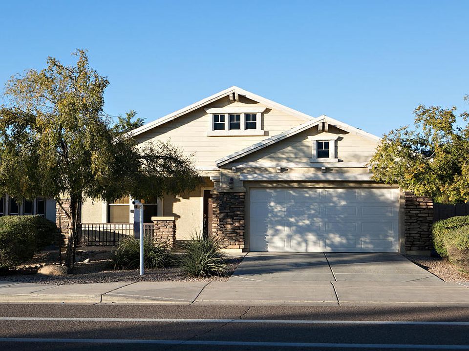 Beautiful home located in Arlington Estates features low maintenance desert landscape. Open space floorplan, large kitchen island, wood cabinets with stainless steel hardware, gooseneck faucet, water sprayer,dishwasher,build in microwave and a gas stove range. 10ft ceilings throughout the home, 2-tone neutral wall paint with a captivating crown molding, wall molding, and baseboard trim. Tile floor in the main areas, laminate wood in the family room, and carpet in the bedrooms. Master suite features large walk in closet and sizable master bathroom. Multi-speed fans in all the bedrooms including living room and family room. Additional features include; built in speakers, and wired security system. Water softener, gas water heater. Backyard features covered patio, planters and green grass pat