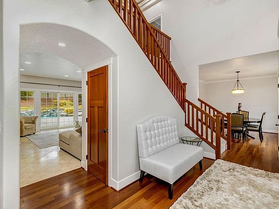 Stunning home in the East Medford Hills on a huge .35 acre lot. One of the nicest back yards with a crystal clear in-ground pool, hot tub with waterfall flows back into the pool, pool heater, outdoor built in BBQ with fridge, mounted TV, lots of grass and mature trees round out this beautiful yard. Inside offers 4/2.5 (one room doesn't have a closet), living room, dining room, family room, and first class theatre room with six comfy recliners. Over sized master bedroom with double sinks, tub, tile shower, large walk-in closet with huge storage room, and double sliders out to a covered deck to relax and watch the sunrise and sunsets. Great kitchen offers granite, custom cabinets, stainless double ovens, gas cook top, an island, and newer dishwasher. Relax in the warm family room with gas fireplace looking out to the pool with double water falls. One year old new heating and air system, wet bar, over sized garage with extra deep bay, and so much more.