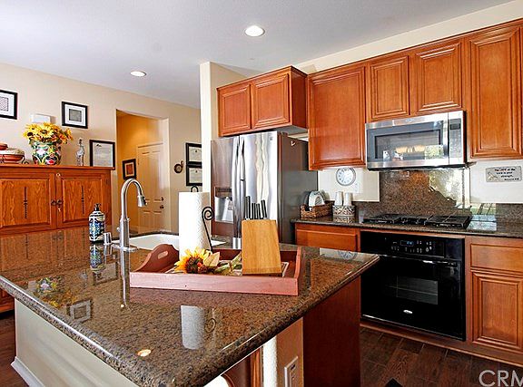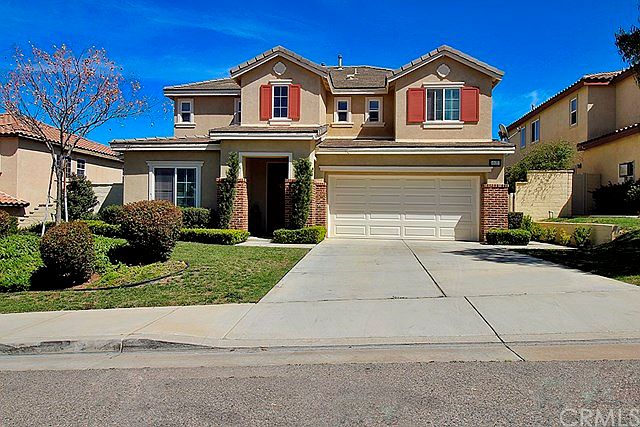 Welcome to this super clean Alberhill Ranch home with 3 bedrooms, 2.5 bathrooms, and large loft. Beautiful mountain views from many rooms of this home. There is a formal living room/ dining room combo that is currently being used as a second master downstairs which has double doors and gas fireplace. Kitchen is large and opens to dining room and family room. Cinnamon spice cabinets, large double door pantry, built in desk and storage drawers with granite island and counter tops. There is an open rail staircase that leads to a loft, master bedrooms suite, two secondary bedrooms, laundry, and full bathroom. The master suite has a view of nearby mountains. Bathroom has spacious walk in closet, dual vanities, garden soaking tub and walk in shower. The home has wood grain porcelain tile throughout except on stairs and in the two secondary bedrooms. The upstairs loft is perfect for the kids to hangout, gym, or second living space. There is also a built in desk and file cabinet/storage that would be a great office or craft area. Backyard is ready for guests or a quiet retreat. Concrete patios and walkways on side yard lead to front gate. Nicely landscaped with sod, tropical plants and fruit trees. Walking trail and park access behind the rear block wall so no immediate neighbors behind. Alberhill Ranch is a wonderful community with a clubhouse, pool, splash pad, parks, and hiking and walking trails. Close to schools, shopping, freeway access. Come check it out!