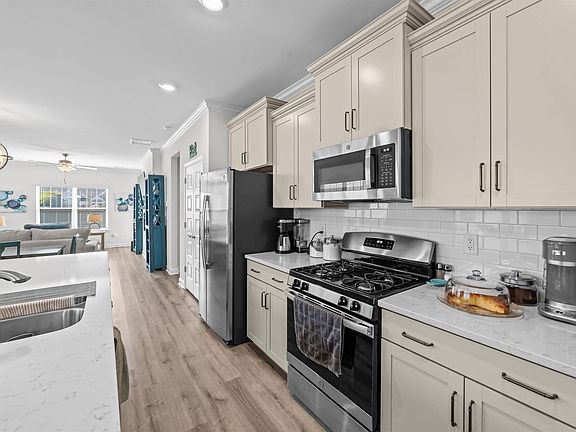 - Features: Breakfast Bar, Kitchen Island, Pantry, Stainless Steel Appliances, Solid Surface Counters