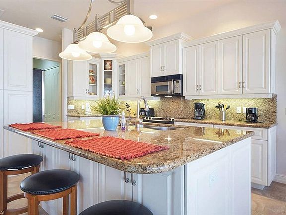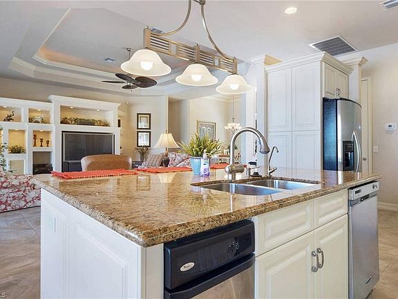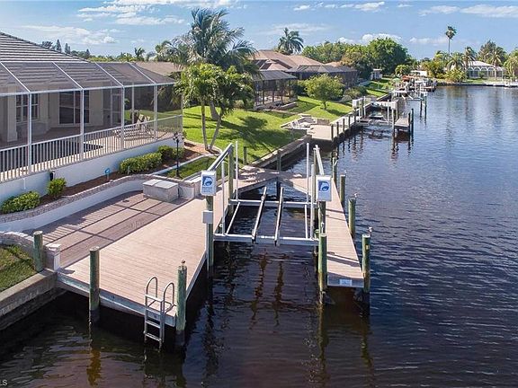 Around the bend boating at this quality built gulf access coastal dream home. This 2003 custom home has All those desirable features of today's new GREAT ROOM homes with its large ISLAND kitchen with GRANITE countertops, 10' tall ceiling w/12'coffered recesses with crown molding, 8 ft tall sliding doors, oversized light stone look tile, TILE ROOF, paver drive way and pavered pool deck areas. The heart of this home is the kitchen with 42' cabinets w/molding above, slide out shelving and corner lazy Susan's, stainless appliances, large walk in pantry and a large breakfast nook overlooking the gulf access canal. In addition, there is a spacious formal dining room with PLANTATION SHUTTERS, recessed ceilings and could easily become a den if desired. All of the bedrooms are generous in size with bed two having two queens beds! The master retreat features a huge walk in closet and a spa like bath with jetted tub and walk in shower w/multiple shower sprays, and dual vanities. Enjoy the wide canal view and Caribbean blue pool with PEBBLE TEC finish. The COMPOSITE dock is ready for your boat + features a 7k boat lift. This home comes beautifully FURNISHED for you to move right in!
