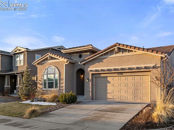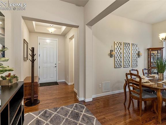 Welcome to your dream home located in the highly desirable Cordera neighborhood! This beautiful, Tuscan style home boasts main level living with 5 bedrooms, 3 baths, and a 3-car tandem garage. From the moment you enter, the pride of ownership shines through in every detail. The spacious, open-concept living area welcomes you with abundant natural light streaming through large windows, accentuating the rich wood floors and high ceilings. The gourmet, eat-in kitchen with a generous center island, stainless steel appliances, upgraded backsplash, and quartz countertops invite culinary exploration and social gatherings alike. Enhanced by an updated fireplace with built-ins, upgraded 8’ interior doors, a separate dining room, and a seamless flow, this space is designed for both relaxation and entertainment.Step outside to the covered back porch and soak in the beauty of the Colorado's outdoors. Retreat to the primary bedroom, with new carpeting and an ensuite 5-piece bathroom complete with granite countertops, a spacious walk-in closet, stand-alone shower, and a luxurious soaking tub – the perfect sanctuary for unwinding after a long day. The basement is perfect for entertaining, featuring a wet bar, 9’ ceilings, a home theater space with built-in surround sound speakers and included projector and screen. Experience the unparalleled lifestyle amenities of Cordera, including access to the clubhouse, fitness center, pool, and scenic walking trails – all within award winning School District 20. Make this exquisite property your own and elevate your living experience today!