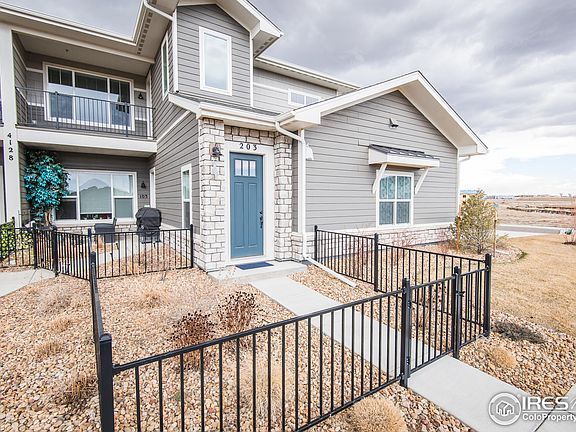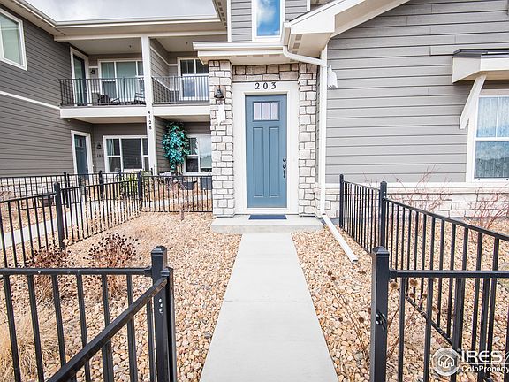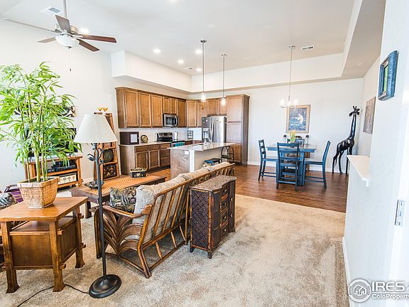 Admire the views of the future park currently under construction. This stunning 2nd story Condo offers an open floor plan, tall ceilings and an abundance of natural light. Includes 3 spacious bedrooms and 2 bathrooms. Many upgrades throughout this home. The living room, dining and kitchen blend seamlessly together, creating a harmonious flow of space. The primary suite offers a generously sized bedroom, attached bath with dual vanities, ample storage, a huge shower, and a walk-in closet. Two additional bedrooms and anther full bath complete the perfect layout. The attached one-stall garage at ground level offers convenience and ease of access. Whether you want to enjoy your morning coffee or unwind after a long day, the covered balcony off the living room is the perfect retreat. Situated in a prime location, this beautiful condo is close to shopping, dining, and offers quick access to I-25 and Hwy 34. Don't miss out on the opportunity to live in this stylish and modern condo! Included in the sale is the Refrigerator, Washer/Dryer, Blinds throughout, Ceiling fans in all rooms, Designer lighting in Kitchen and dinning room, Undercabinet lighting in kitchen, Cabinets in Laundry and Upgraded tile in bathrooms!