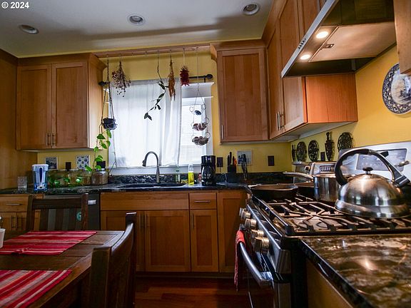 Three bedroom, one bath home in the heart of Southeast Portland. Extensive remodel in 2018/2019 from the studs out. Exquisite primary suite accessed by a dramatic spiral staircase with skylights letting in ample light. Brazilian hardwood floors throughout. The floor-to ceiling bookcase with rolling ladder is a real focal point on the main floor. Enjoy the gourmet kitchen with all stainless steel appliances. Great room concept with living, dining, and kitchen areas blending seamlessly together. The basement is partially finished with an additional room that serves as an office/craft area. The double car garage is reached through the alley and is surrounded by lovely gardens with grape arbors and rain collection barrels. This home is a rare find.