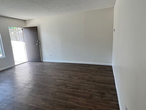 Large 1 bedroom unit on the ground floor in North Park featuring wood-like solid floors in living room, kitchen, dining area, and bath. The kitchen features stainless-steel appliances including a built-in microwave and gas stove, plus lots of cabinet space.