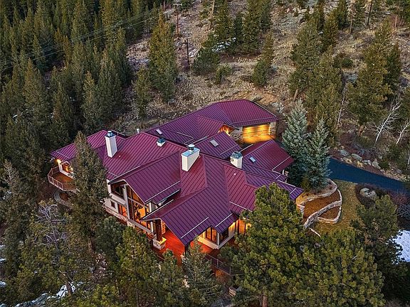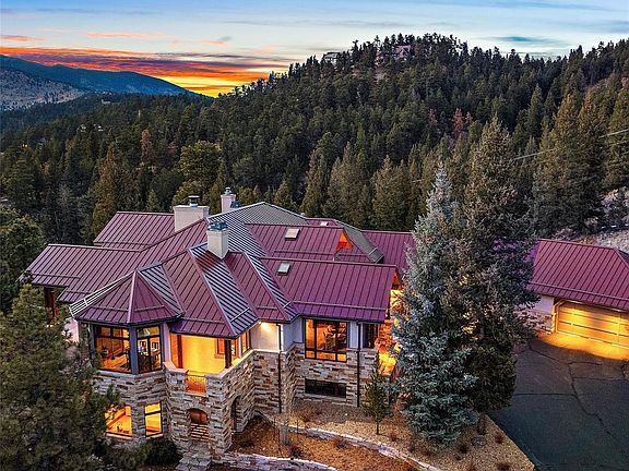 Breath-taking snow cap views of Mt. Blue Sky abound from this luxury estate in the private, gated community of Troutdale in the Pines located off historic, scenic Upper Bear Creek Road. The setting of this 5 bedroom, 7 bathroom home, the high-end finishes and the detailed craftmanship combined with the convenient distance to Evergreen and Denver amenities will make this a home you’ll want to tour. Walking in the front door, you’ll be mesmerized with the open feeling and the expansive views from the entry and great room. The gourmet kitchen with knotty alder cabinets, refinished cherrywood floors, granite counters, an eat-in nook, high-end appliances is open to a main level family room and a spacious west facing deck with Brazilian hardwood flooring, beautiful views and of feeling of being nestled in the pines. Vaulted ceilings and travertine tile floors enhance the formal feel of the dining room. Working from home? A main level office is detailed with custom wood built-ins, a wood paneled ceiling and incredible views. Down the hall is a spacious, primary bedroom/bathroom suite with expansive views, refinished cherrywood floors, a gas fireplace with a custom mantel from Turkey, a luxurious bath with a jetted tub accented with a gas fireplace, a steam and rain shower, dual vanities, and two oversized walk-in closets. Two stairways create access to the lower level with plenty of room to entertain, relax and to spread out with 4 additional bedrooms each featuring private baths and walk-in closets. This lower-level family room is designed to accommodate multiple options – movies, playing pool or foosball, entertaining at the bar or in the impressive wine room. If you appreciate efficiency, the utility room is impressive with 2 Burnham furnaces and an oversized hot water heater to operate the radiant in-floor heat throughout the home including the garage. Heat, custom epoxy sealed floors, a workshop/studio, cathedral ceilings and storage in the garage.