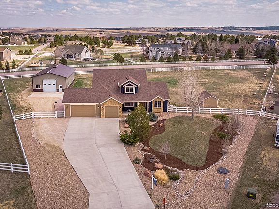 Enjoy the serenity of country living, with room to breathe, on your own 1.5 acres in a community conveniently located between the towns of Parker and Elizabeth. Start your day with amazing sunrises on the large rear patio complete with a fire pit and end the day relaxing with a beverage to view mountains and spectacular sunsets from a welcoming covered front porch. Built in 2019 the 1500 sq ft Cleary pole barn with cement flooring is plumbed for electrical (ie. PCV pipe from exterior to interior of barn but no wiring) and is perfect for your outdoor toys, tractor, RV workshop and more. Complete with a cement driveway, the oversized 3 car garage (21 x 36) provides enough storage for SUV's and the included shelving and has a convenient service door to the backyard. Inside is a bright and open floor plan with beautiful vinyl plank flooring throughout the main living areas, installed in 2019. The open kitchen, totally remodeled in 2019, has lots of storage, under cabinet lighting and stainless steel appliances. The kitchen opens to a great room that offers a vaulted ceiling and a cozy fireplace. Overhead lighting with ceiling fans in all bedrooms, loft and great room. A main floor master bedroom with a walk-in closet and 5-piece master bath make for a perfect retreat. The second level offers 2 bedrooms, a Jack and Jill Bath and a spacious loft suitable for a study/game room. The huge backyard has a large patio with plenty of room for an outdoor living area to enjoy beautiful Colorado evenings. The backyard is entirely fenced ready for kids and pets to roam and play. A dog run is attached to a heated 12 x 10 utility shed that has a pet door. This move-in-ready home is conveniently and privately located at the end of a cul-de-sac. Enjoy the extra benefit of living in a community that does not have an HOA fee.
