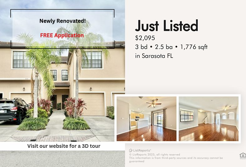 ** New listing with 10 Stars Property Management ** Beautiful 3 beds 2.5 baths is available for rent in Sarasota, FL. The area surrounding 4129 Via Piedra Circle is rich with attractions and amenities. Notable parks include Red Bug Slough Preserve, offering trails for walking and wildlife observation, and various Sarasota County Parks for recreational activities. Nearby attractions feature the Sarasota Jungle Gardens and the cultural Ringling Museum of Art. For beach lovers, Siesta Key Beach is famous for its stunning white sand, while Lido Beach provides a quieter experience. Major roads like Honore Avenue and Bee Ridge Road facilitate easy access to shopping centers, dining, and other local services, making this location convenient for both relaxation and exploration. 3D Tour Available: FREE APPLICATION Features: - Application fee will be credited back on the 1st month of rent if approved - Spacious living area with room to relax and entertain - Ceiling fans in various rooms for added comfort - Laminated wood floors for a modern and easy-to-maintain look - Two-story layout providing separate living and sleeping areas - Tiled kitchen area for a clean and durable surface - Stainless steel kitchen appliances for a modern and stylish kitchen - Kitchen island with added counter space for meal preparation - Dishwasher for hassle-free kitchen cleanup - Washer and dryer included for added convenience - Window coverings for light control and privacy - Cozy carpeted bedroom for a comfortable feel - Walk-in closets for ample storage and organization, making it easy to keep your space tidy and stylish - Bathtub for relaxation and unwinding, providing a perfect escape after a long day - Walk-in shower for a luxurious and refreshing experience, adding a touch of elegance to your daily routine - Covered patio for outdoor relaxation and entertainment - Private single-car garage with additional separate single-car parking - Tenant is responsible for all utilities Pets are allowed. No more than 2 pets per property. Weight limit of 55lbs per pet. No aggressive breeds. Applicants must complete a free pet application and have animal approved with vaccination record. The monthly pet fee will be determined by your pet screening score. Does not apply to medically/emotional support prescribed and/or service animals. At 10 Stars, we offer multiple services to make your stay with us easy and comfortable. We have a same-day application approval and a quick move-in for no additional cost. Our team is professionally trained and will be able to assist with any leasing, billing, or maintenance issues our tenants have. We also offer an emergency line available 24/7 for any urgent cases. Tenants have access to an online portal where they can make rent payments, communicate with our team and get updates on their payments and maintenance requests at all times. THE FIRST MONTH AND SECURITY DEPOSIT ARE REQUIRED Renter's insurance is required prior to moving in. Rules and Regulations are on our website! Only $65 non-refundable application fee per adult with 10 stars property management