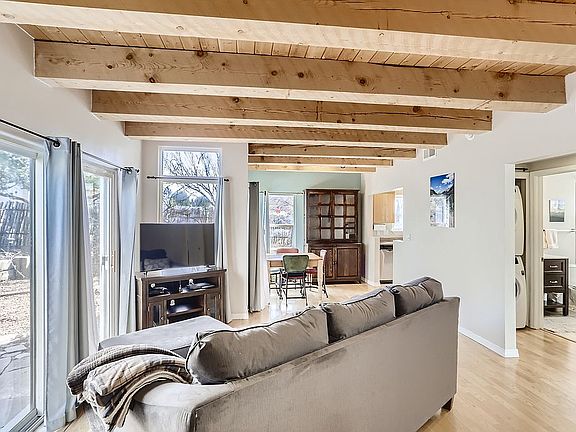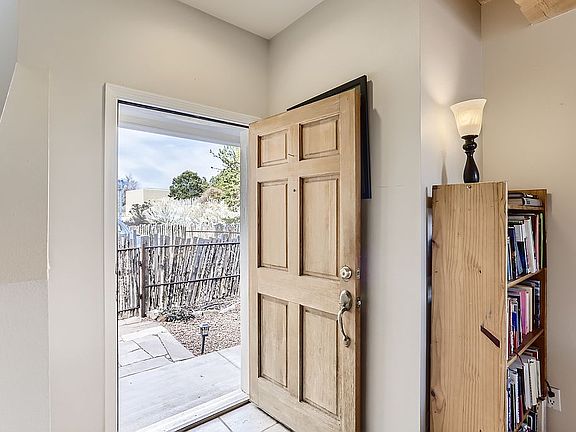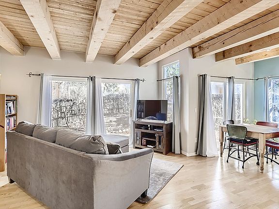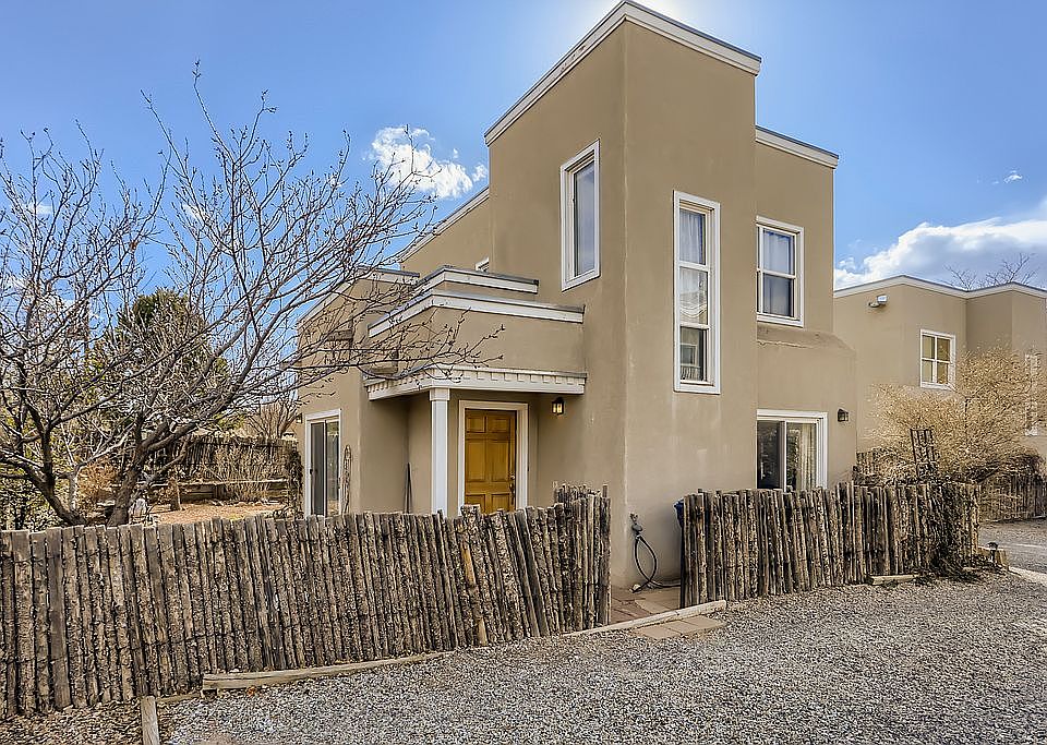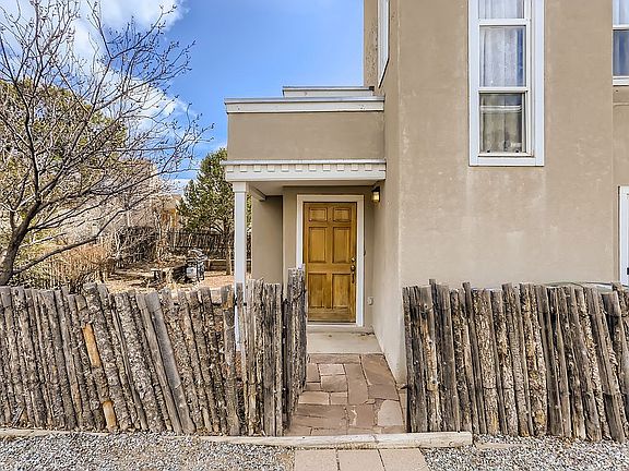 Bright, well maintained 3 bdrm, 2 full bath home in highly desirable Nava Ade subdivision with easy access to walking trails, a swimming pool (one block away), fitness facility, steam room, community park and Monte del Sol, a highly-desired grade 7-12 charter school. Upon entry through a gated, landscaped yard, you will instantly feel the warmth of the open living room which flows into an adjacent dining room. Both living spaces have beamed ceilings with bright, natural light through 2 sliding glass doors which lead to a flagstone patio surrounded by flowers and fruit trees. The galley kitchen features a glass side door which offers extra light and connects to the driveway, allowing easy access for bringing in groceries and other items. A kitchen window offers luminous views of the raised garden beds, rose bushes, and colorful crabapple tree. The primary suite is the only bedroom downstairs and features his and her closets, high ceilings, a sliding glass door, and a full ensuite bathroom. The laundry space accommodates stacked, full-size washer and dryer units and the storage area under the stairway offers plenty of room for seasonal items. The upstairs features 2 additional bedrooms along with a full bath. One room offers stunning views of the Sangre de Cristo Mountains, the other has a built-in California closet office layout and gets plenty of natural light. The bathroom vanities, kitchen and entry tile were all replaced a few years ago. The original wood floors throughout are in great shape. The stucco and roof were just replaced, and the exterior has freshly painted white wood trim to fit the territorial style. This was completed in April 2022 and these updates come with a transferable warranty! This is a great starter home with room for a family in a safe, well-planned subdivision.