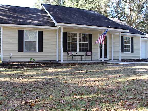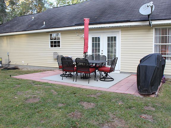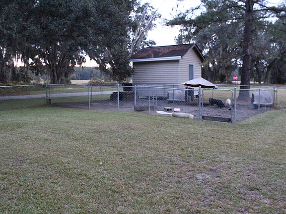 This adorable house is a great home to raise your family in! MOVE-IN READY!! New paint, updated kitchen with French doors, stainless appliances, refrigerator and microwave. This house includes carpet, wood laminate flooring and tile. Home features a split bedroom plan, living room with vaulted ceiling, laundry room, single car garage/workshop, front porch, back patio overlooking a huge fenced in backyard with 200 year old live oak trees, electric RV/generator hook up outlet and 16x24 pole barn! 12x12 utility shed included. 0.56 acre high lot and it drains well. New HVAC 2014. NO HOA so bring your chickens, too!