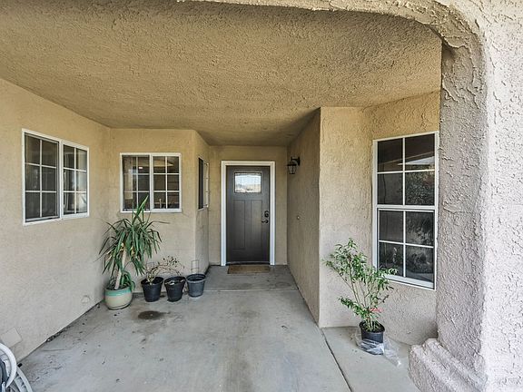 Beautifully remodeled 4 bedroom home with paid solar. Greeted by large cozy front porch this popular floor plan will be sure to impress. Home has both living and family room areas for the family to spread out. Plank tile flooring thru out. Kitchen has been completely remodeled with new cabinets, butcher block counters, drink fridge and stainless appliances including refrigerator. . Living room features large brick fireplace and French door leading to back yard. All good size bedrooms and primary includes more French doors leading to patio. Bathroom vanities have recently been repainted. Great size covered patio and a back yard to make all your own. Block wall fencing all around. NEW high efficiency furnace. Great laundry room that includes washer and dryer. PAID solar. RV parking.