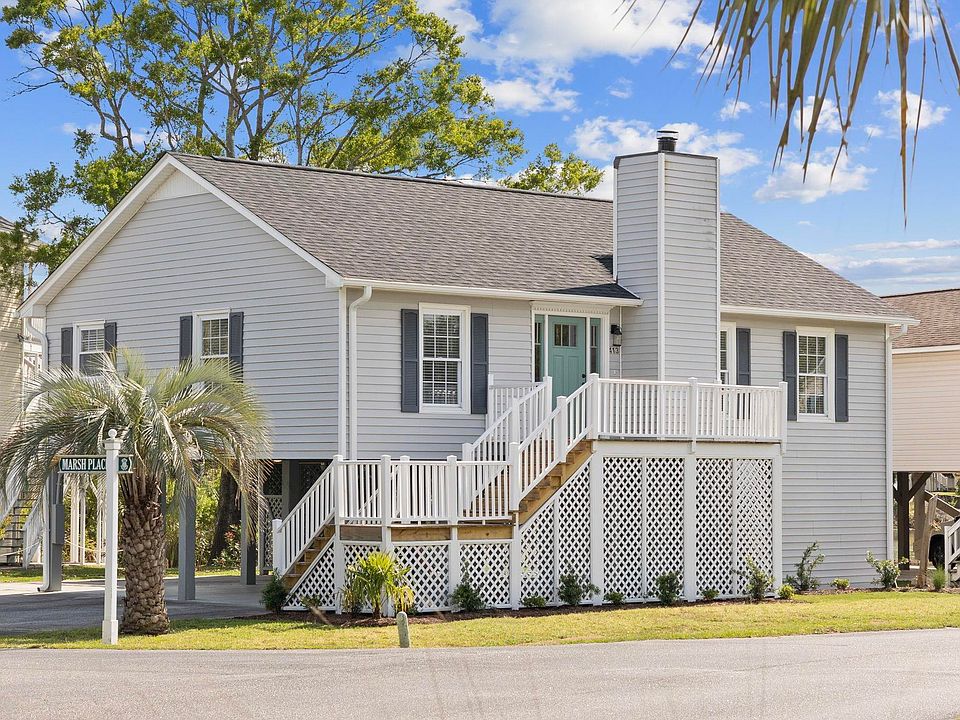 HAVE YOU BEEN LOOKING FOR A RAISED BEACH HOUSE FOR A SECOND HOME THAT IS IN CLOSE PROXIMTY TO THE OCEAN ? THIS CORNER HOUSE IS SITUATED IN THE QUAINT COASTAL COMMUNITY OF SALTERS COVE. Salters Cove doesn't allow for short term or vacation rentals which adds to the serenity of this amazing community with a mixture of primary homeowners and secondary home owners. You will enjoy the salt air and views of the salt water marsh and pond from the covered porch of 413 Bay Dr. Bring your Golf Cart and enjoy riding to the beach or to some of the great amenities of the community which include a tropical swimming pool surrounded by palm trees. There is a clubhouse along the pond in addition to a play ground and pickle ball courts. And you are only a short golf cart ride to the new Surfside Pier and popular restaurants. This raised beach house has had significant updates and shows like a model home. The kitchen has brand new cabinetry with soft close doors and drawers with stunning granite counter tops, new stainless appliances including refrigerator. This kitchen also offers a pantry. A large laundry room is just off of the kitchen with new cabinetry and a convenient bar for hanging clothes. The bathrooms have new cabinets with quartz counter tops. The large owners suite has a huge walk in closet with wood vented shelving and the owner's bathroom has a long double vanity and shower. This house is being sold partially furnished which includes the great room furniture, porch furniture and the decorative linen / towel storage cabinet in the owners bathroom. There is natural light that is filtering in from all directions. The vaulted great room has a gas log fireplace with a raised hearth. Current owner has never used fireplace and isn't aware of any problems but it is being sold as is. You will love the large covered area underneath the house. There are three bays with a large storage room for all of the beach toys. This is a split bedroom floorplan that provides privacy when you have family or guests visiting. There is wide plank LVP flooring with a natural tone throughout with no transitions. This was a custom stick built house not modular. This is a Simply Stunning Beach House that must be seen to appreciate when comparing to other houses. Come and enjoy what Coastal Living has to offer. Schedule a private tour with your Realtor.