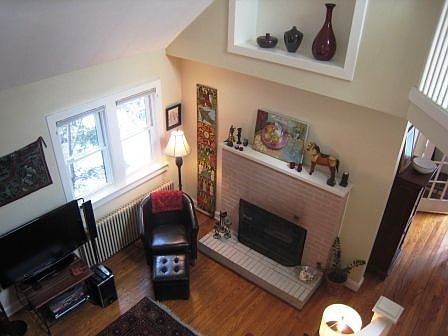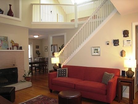 Adirondack porch charm meets soaring interior space in this contemporary take on the traditional Cape.2-story LR w/fpl opens to cozy dining rm and large stylish kitchen.Dramatic open stairway to loft bedroom.Separate office & 2 main level bdrms for your convenience.Finished lower level with full bath.Driveway & carport, lush corner lot w/mature plantings.0.8mi to Metro.VERY SWEET HOUSE!open2/28 1-4