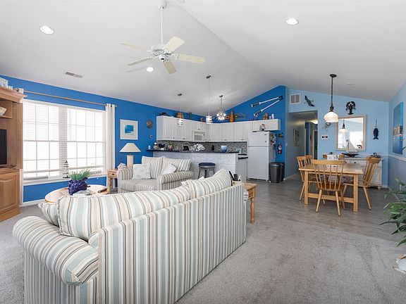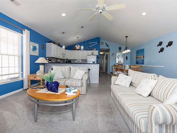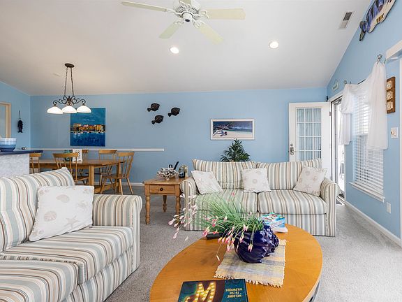 Welcome to this lovely three bedroom, two bath year-round top floor condominium! It’s just one short block to the famous North Wildwood beach and boardwalk. Entering through the front door, you are in an immaculately kept home that offers vaulted ceilings and natural light, showcasing an open floor plan of the living room, kitchen, and dining area. The bright kitchen has stunning, blue, easy-care Quartz countertops with lots of prep space. The cabinets offer ample space for all your kitchen needs, and the above cabinet LED color changing lights highlight your decorating treasures. The dining area has plenty of room for your large gatherings. Down the hallway you will find two bedrooms with plenty of closet space and wall mounted TV’s, and a large hall closet separates the rooms. There is also a newly renovated (2020) full bath with tub surround and tile flooring, As you continue towards the back of the unit, you will find a newly remodeled (2023) laundry room with a full size washer and dryer, durable vinyl flooring, and lots of cabinet space for all your storage needs. The end of the hallway leads you into the tranquil retreat of the primary bedroom with gorgeous primary bathroom (renovated 2022) and an extremely spacious walk-in closet. On either side of the king-size bed are custom made free-floating nightstands with USB charging outlets. The wall mounted TV ensures you will not miss any of the current shows you are binging. The spa-like primary bathroom showcases lovely custom flooring, a spacious linen closet, and a large walk-in shower with a bench, shelf, and soft pebble floor. On the partially covered deck you have plenty of room for a table, chairs, and recliners for sunbathing. The privacy partition separates you from the adjacent unit, but you can still see the ocean from the porch. The condo has plenty of parking, with two spots in the shared garage and two additional spots in the driveway for a total of four cars. In the back of the garage, a private storage room completes the area to store all of your beach needs or use as owners storage should you decide to rent the unit. Around the back is a private, covered, outdoor shower with hot and cold water for washing off all the sand at the end of a wonderful day at the beach.