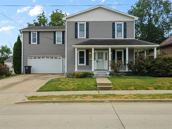 This beautiful 4-BR, 2.5-BA residence features a 2-car attached garage, and is perfectly positioned within walking distance of the charming downtown square and city park! Step inside to discover a spacious main level, highlighted by an oversized dining room with newer lighting and a stunning chandelier. Enjoy added safety with an automatic hallway light. The inviting front porch wraps around the home, providing a cozy space to relax and enjoy the neighborhood. Upstairs, you'll find 4 generous bedrooms, a convenient laundry room, and a versatile sitting room with a kitchenette—ideal for entertaining or creating a 2nd living space. The backyard is a true oasis, designed for relaxation and enjoyment with a park-like ambiance. The newer, sturdy deck is perfect for outdoor gatherings, while the water fountain feature adds a touch of tranquility. A well-sized utility shed offers additional storage space for all your needs along with a storage loft in the garage for seasonal item storage.