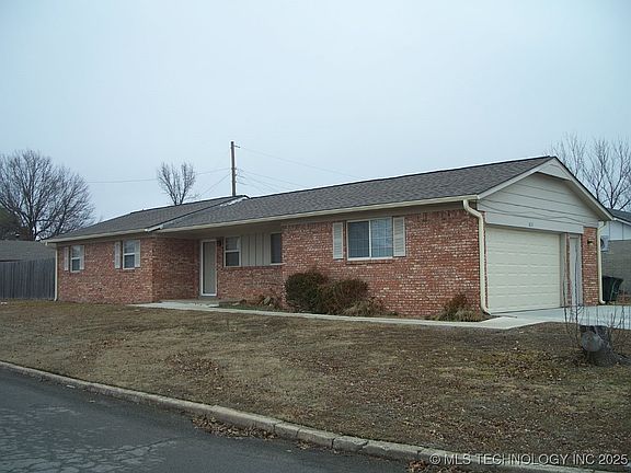 Great full brick home on corner lot. Three bedrooms, 1-1/2 baths, kitchen with gas range, dishwasher & stainless sink, dining area off kitchen. Living room opens to covered back patio as well as covered front porch. Ceiling fans in living room and all bedrooms. New in 2023: roof, flooring, concrete driveway, upgraded insulation. Newer vinyl windows. hot water tank new in Jan. 2024. Large two-car garage with automatic overhead door opener. Privacy fenced backyard with large storage building. Don't miss out on this opportunity to own an affordable home.