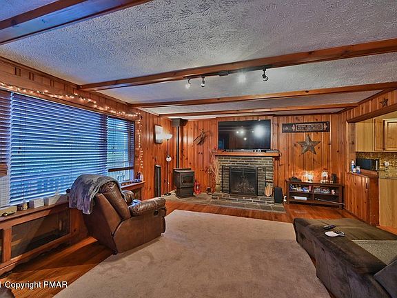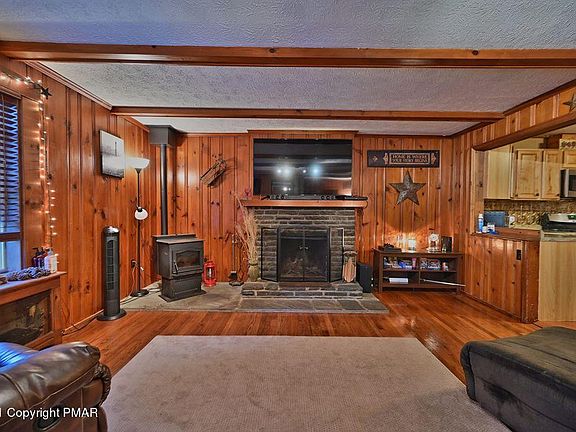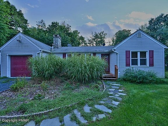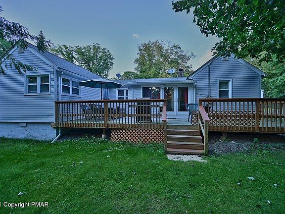 Showings begin on 9/19. RANCH WITH ALL THE CHARM YOU NEED! On a tree lined idyllic street in the heart of the Poconos, this home is an eye catcher! Knotty pine walls, stone fireplace, original hardwood floors, the large living room opens to the completely revamped kitchen. Granite counters, new cabinets and appliances, new flooring, and wide open for the cooks to enjoy company as they prepare the meal! The dining room is attached, all new, and had double doors to a brand new deck across the back of the home! 3 generous bedrooms, 1.5 baths, huge cedar closet, separate large laundry + utility room, opening to the garage. All on .76 of an acre. Home was sided, new windows, new roof, all btw 2008 + 2010. Kitchen was done in 2013, deck in 2018. No dues, low taxes!