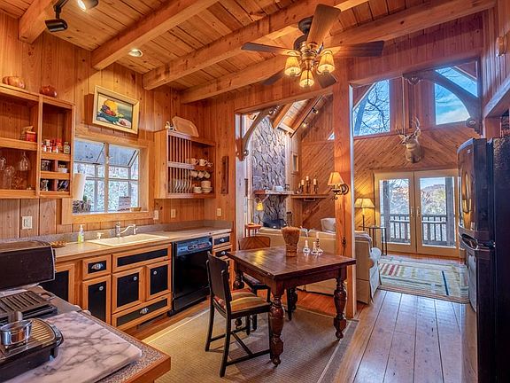 WONDERFUL VIEWS FROM THIS PRIVATE, UNIQUE AND FURNISHED CHALET ON OVER 6 ACRES THAT'S CLOSE TO TOWN! Your Great Room has a stone fireplace to warm the chilly mountain evenings with French door access to your screen porch to relax while admiring the long range mountain views. This home features a custom wood interior with exposed wood beams that makes for a lodge feel. Your eat-in kitchen has beautiful custom cabinetry. Down the hall is your guest bath & large laundry room with built in shelving. Upstairs to your loft bonus room, currently used for guests. Downstairs is your Master Ensuite with double windows, tile shower and closet with built-ins. This amazing mountain home is MOVE-IN READY!