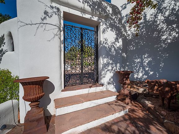 Located mere minutes from the Plaza at the end of the street on just over an acre with some sweet South and West views, this 4,250 sq ft 4 bedroom, 3 bath two story home is stylishly and tastefully updated and enjoys several outdoor living areas. Entering through wrought iron gates, the walled front courtyard has a corner kiva fireplace around which to sit and enjoy the evening, as well as the soothing sound of the big Mexican fountain. The front foyer has fun decorative tile floors, and this level also has a large family room with fireplace, big windows and French doors opening to the enclosed courtyard, laundry room and private guest room with a full bath. Up a grand staircase is the main living area, with a nice large living room with gorgeous fireplace, that is open to both the dining area and kitchen. The gourmet kitchen with copper countertops, gas cooking, wet bar and pizza oven is both functional and beautiful. A flagstone patio off the landing by the living room, enjoys a wonderful protected Southern exposure so as to enjoy the out of doors nearly year round! The primary bedroom is large and has a deck facing West for sunset skies, plenty of closet space, a luxurious bath with custom limestone sinks, big soaking tub and a separate shower. The other two bedrooms on this upper level are generously sized and share a full bath. Many custom architectural details and finishes; from custom fixtures and doors, to hardwood, sisal and tile floors. With plenty of guest parking, a two-car garage, AC and a furniture package if desired, this is a special home showing great pride of ownership and love.